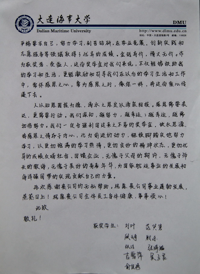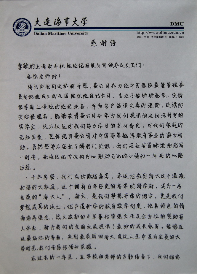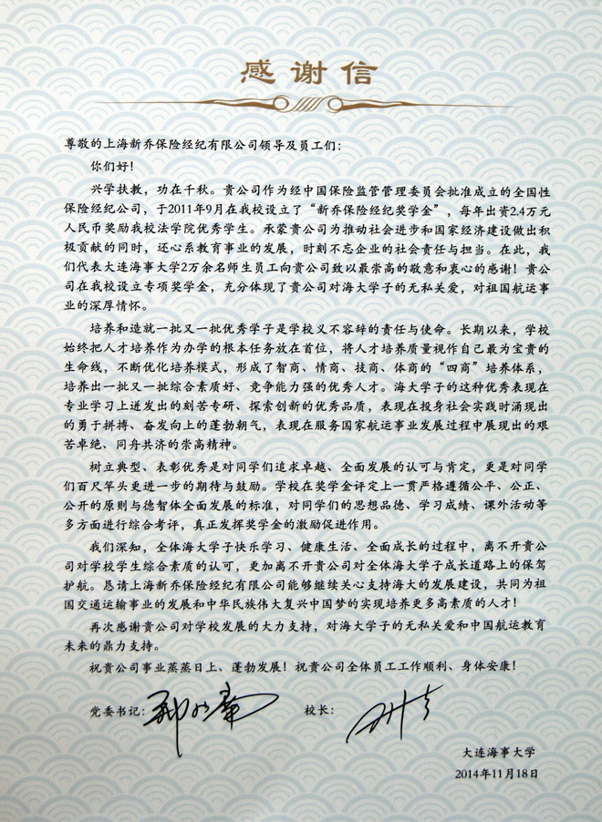 日前,大連海事大學向公司發來熱情洋溢的感謝信,對公司自2011年以來在海大設立"新喬保險經紀獎學金",并每年出資2.4萬元獎勵法學院優秀學生,致以崇高敬意和衷心感謝。同時,九名2014年度法學院優秀學生獎學金獲得者也發來親筆感謝信,表達對新喬的感恩之情。
